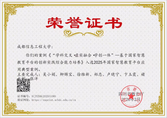 吴小娟团队申报的《“学科交叉·虚实融合·学创一体”——基于国家智慧教育平台的创新实践综合能力培养》,成功入选四川省高等教育十大典型案例,是我校首次斩获该项荣誉。